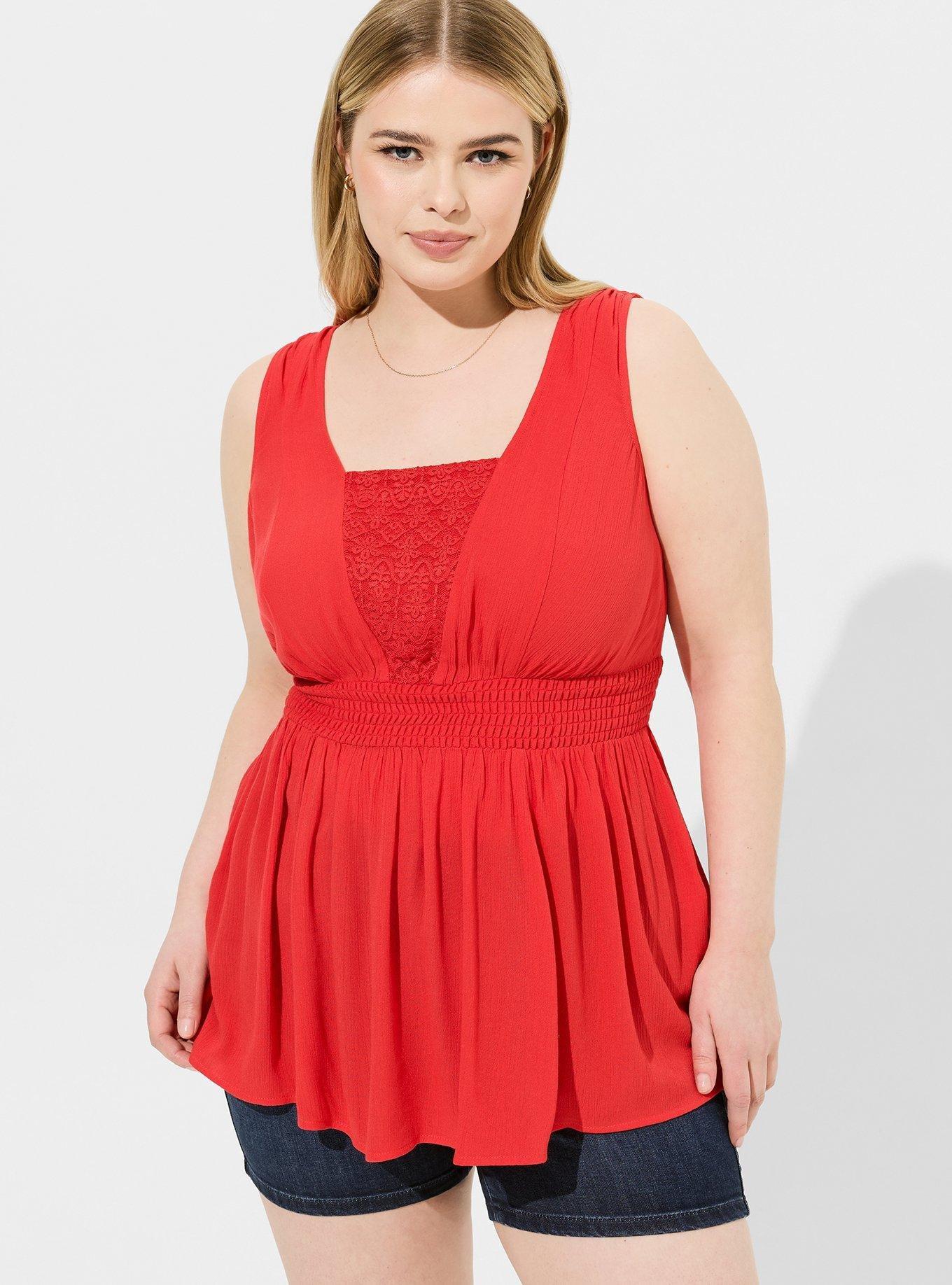 FIT Measures 30" from shoulder (size 2). MATERIALS + CARE Washable Gauze woven fabric: The lightweight, breathably soft fabric you love is, at last, wash, wear and go! Stretch level: None. 74% rayon, 26% polyester. Machine wash cold. Tumble dry low. Imported. DETAILS V-neck. Sleeveless. Crochet detail.