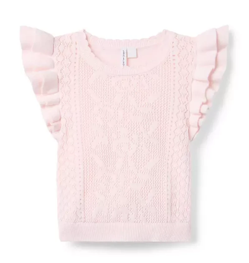 You could say this soft sweater top is a close-knit favorite. Designed with crochet florals, ribbed details and flutter sleeves. 100% Combed Cotton; Front Lining: 100% Cotton Partially Lined Short Sleeve Machine Wash, Inside Out, Gentle Cycle; Imported