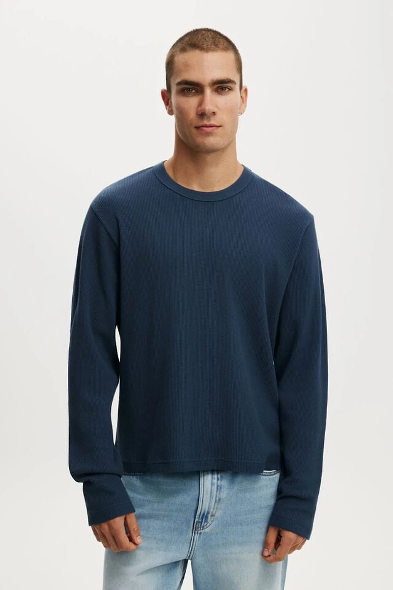 Update your layers with the Cropped fit Textured Long Sleeve Tee. With waffle textured fabric and a crew neckline, this essential long sleeve top will keep you warm any day of the week.