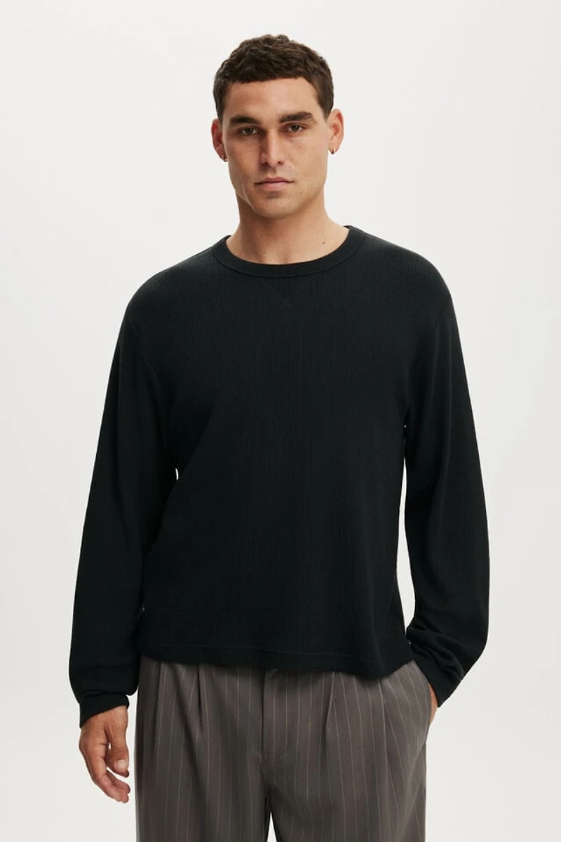 Update your layers with the Cropped fit Textured Long Sleeve Tee. With waffle textured fabric and a crew neckline, this essential long sleeve top will keep you warm any day of the week.
