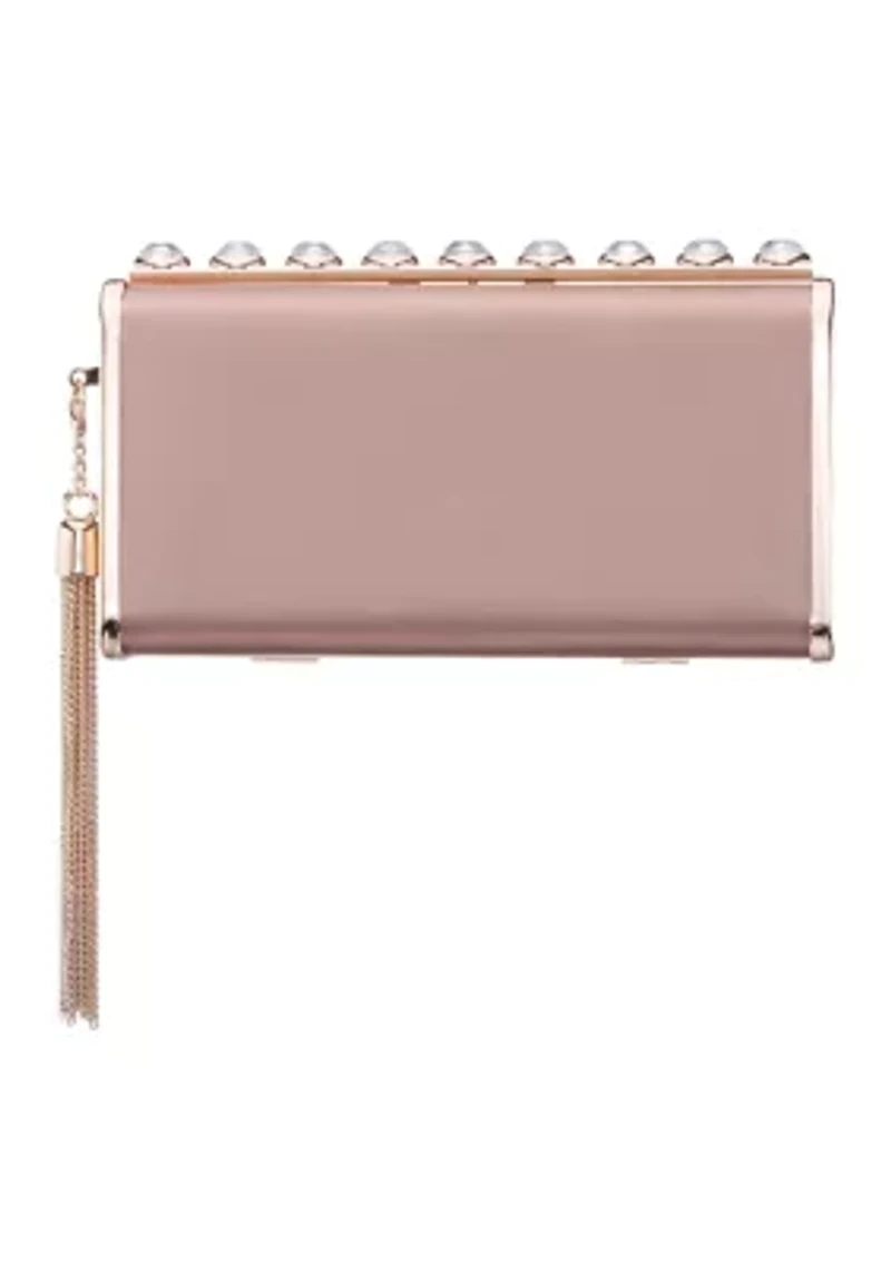 Make a statement with this stunning minaudiere from Nina. Featuring a dazzling crystal-encrusted exterior and a chic tassel detail, this compact evening bag adds glamour and elegance to any formal look. Perfect for weddings, parties or special occasions where style meets sparkle. Removable strap with 18" drop Interior: 1 slip pocket Imported Product Specifications 7.25" L x 4" H x 1.75" D Material & Care Polyester Spot clean only