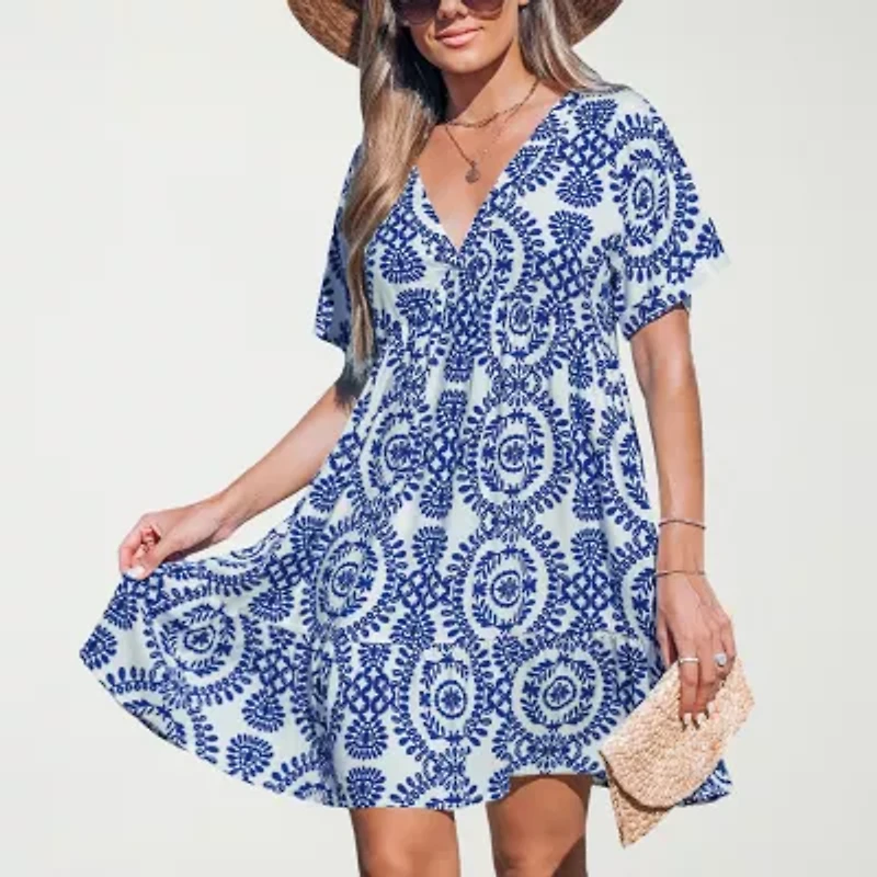 Effortlessly stylish and breezy, this boho-inspired dress features an allover blue and white medallion print on a lightweight, flowy fabric. The relaxed silhouette with short sleeves and a V-neckline offers a flattering, comfortable fit perfect for warm-weather adventures. Pair it with sandals and a floppy hat for a chic beach look.