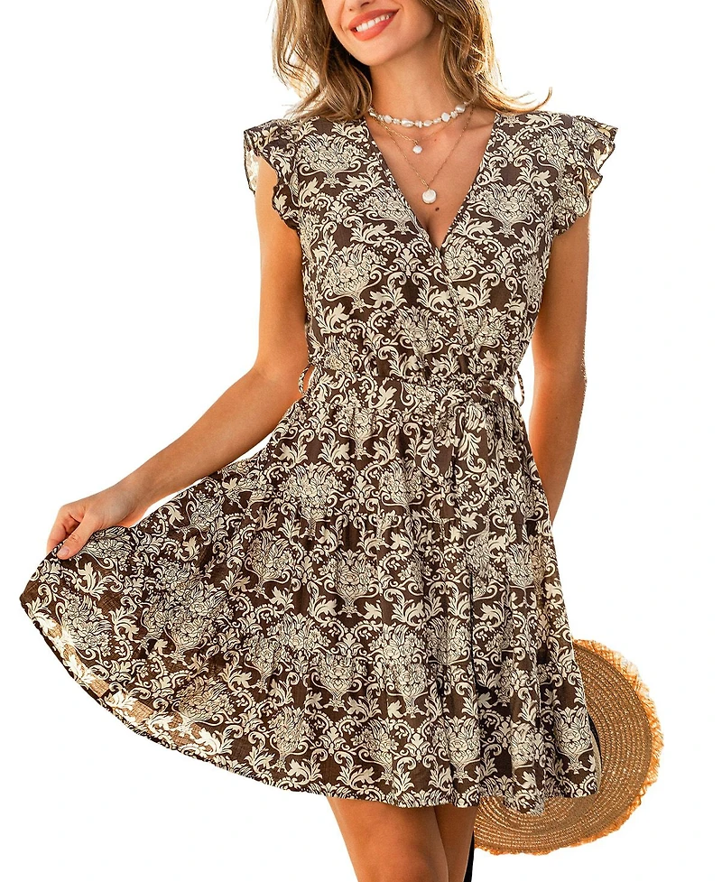 A floral mini dress designed for effortless summer days. Featuring a surplice V-neckline, short sleeves, and a flattering A-line silhouette with a gathered waist and ruffled hem, this woven style delivers playful, easygoing charm. Product Code: CAA05F5M002HG