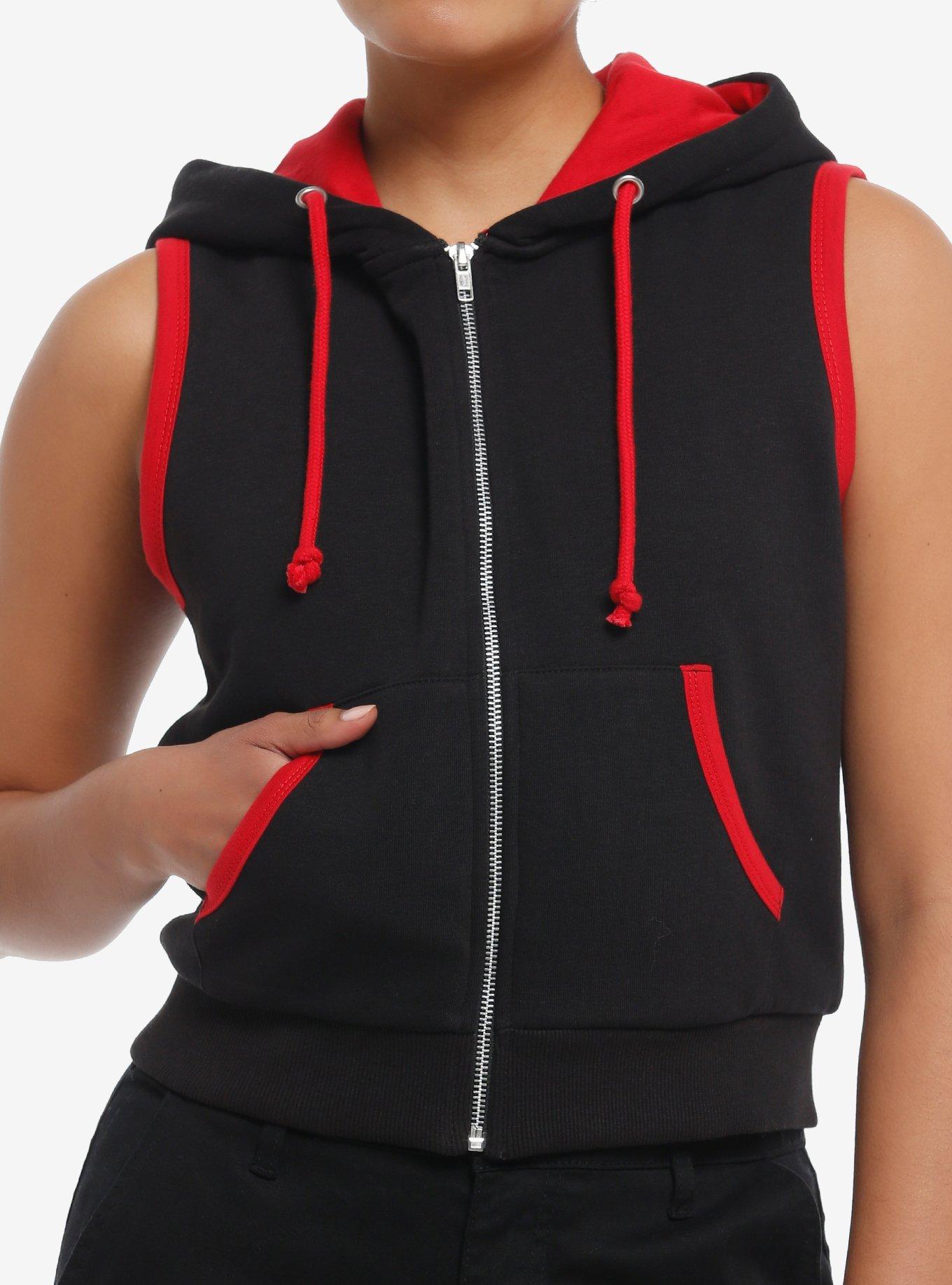 We're bringing some edge to your look with this sleeveless hoodie! It comes in black with a contrasting red on the drawstring cords, pocket and sleeve trim. Complete with hood and central zipper.