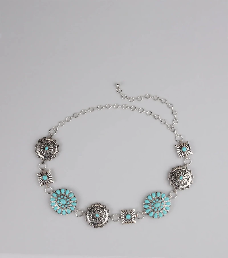 Add a touch of bohemian flair to any outfit with this concho belt featuring colored plate designs and a secure lobster clasp closure.