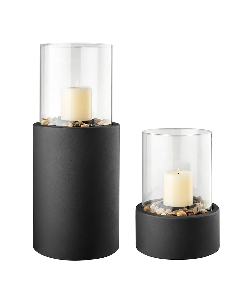 Easy and economical, the Tabletop Pillar Hurricane Candleholder with Pebble Base is a great way to generate warmth in your living space while also adding a touch of sophistication to your ambiance. Modern in every sense of the word, this elegant tabletop candleholder sports a sleek black metal base, a pillar candleholder center, and a ring of decorative rocks. This candle holder offers the perfect centerpiece on your dinner table, nightstand, or your patio table. Featuring a sleek black metal base, a removable cylindrical glass body, and a border of pebbles to highlight every candle, this tabletop candleholder is designed to bring warmth and sophisticated style to any space. This remarkable, contrasting materials design adds a unique touch to any setting. Soothing, safe, and simple to use, the Danya B. Pebble Tabletop Candleholder is available in a Small or Large size to best accommodate your space. Combine both sizes for larger tables and cohesive display of candles across your home.
