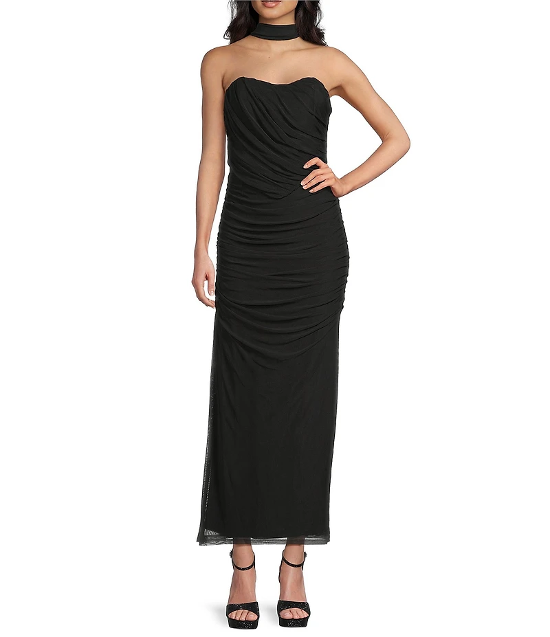 From Dear Moon, this dress features: Mesh fabric Strapless neckline Scarf Twofer Zip back closure Approx. 53.5" length Polyester/spandex; lined Hand wash/line dry Imported.