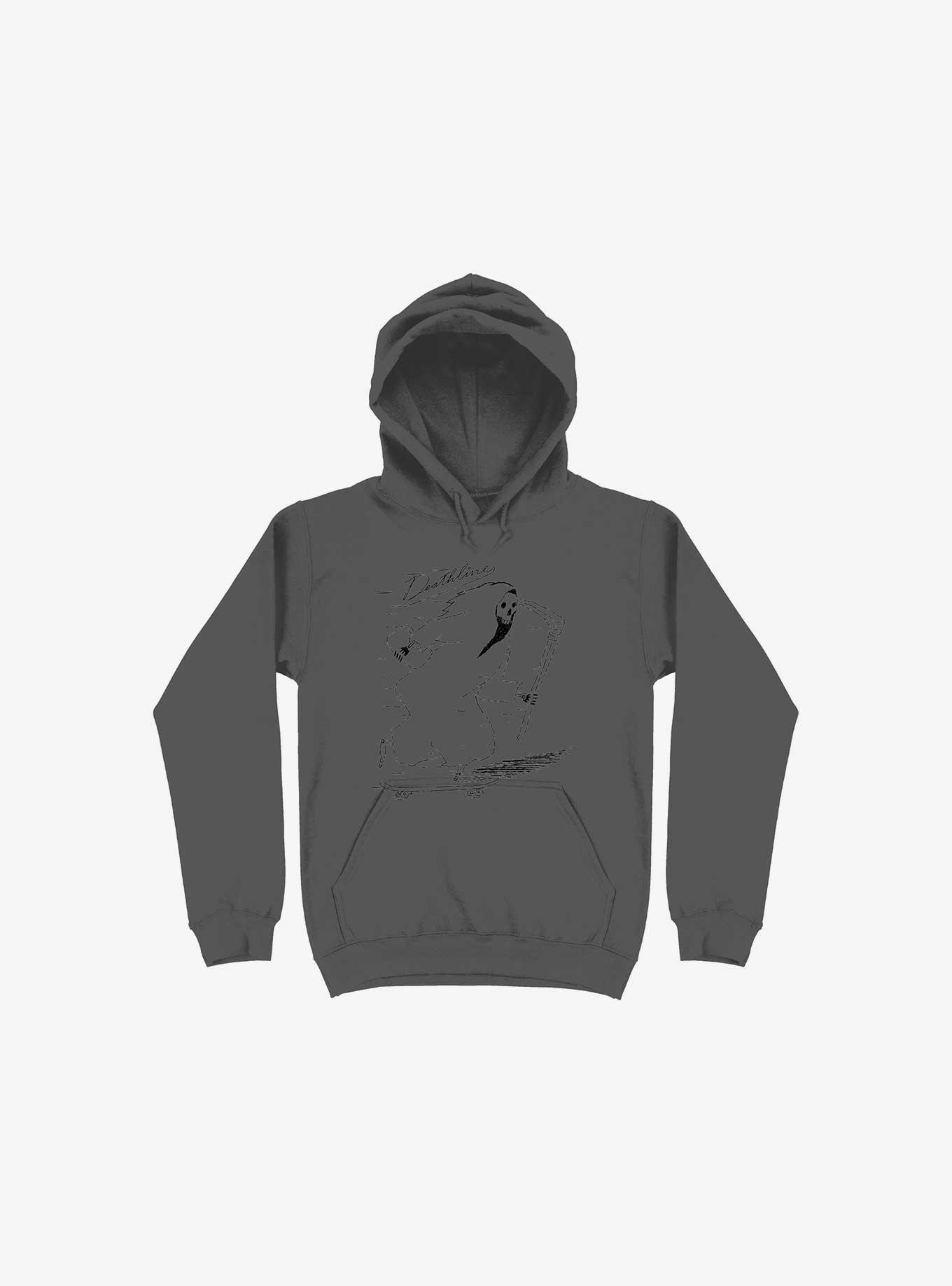 Gnarly. This asphalt grey pullover hoodie features a graphic of the Grim Reaper on a skateboard with "Deathline" verbiage above. Officially licensed art from delcore.