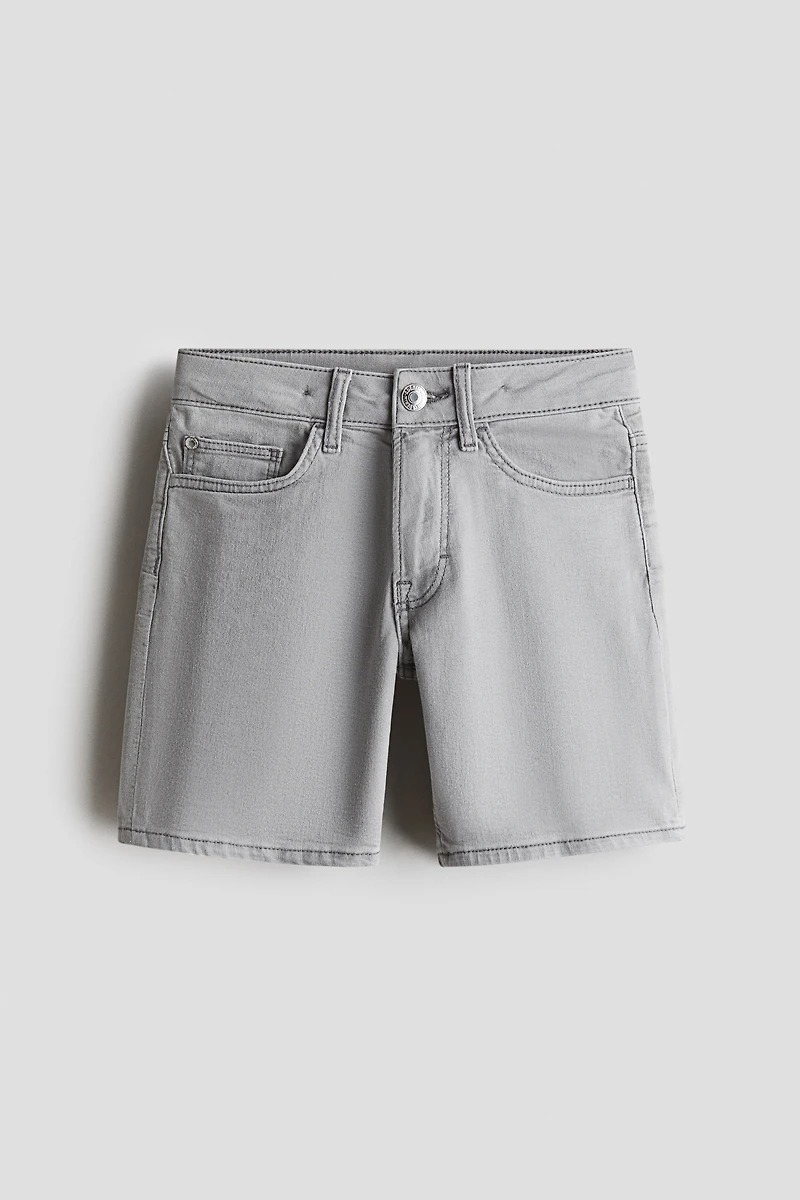 5-pocket shorts in washed denim. Adjustable elastic at waistband and zip fly with button.