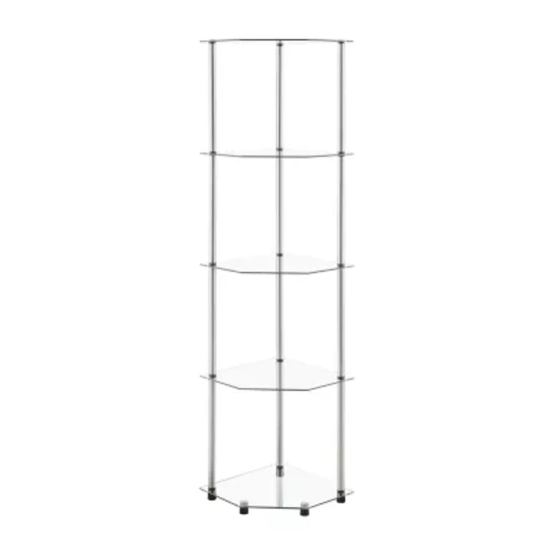 Upgrade your storage or display space with the luxurious design of the designs2go classic glass 5 tier corner towers by convenience concepts. This classic bookshelf design is the perfect piece to place in any corner of your home that needs additional display or storage room. Plenty of surface space is available thanks to five tiers of shelving to display decorative home d�cor or to showcase unique collectibles. Shelves are made of clear tempered glass and the legs are made of sturdy rust-resistant stainless steel making this contemporary piece practically maintenance-free. In addition, rubber soles cover the bottom of each leg to help protect your floors. This contemporary tower bookshelf can easily be assembled in minutes and requires no tools to put it together. Complete your modern home look with additional pieces from the designs2go classic glass collection by convenience concepts, each sold separately.
