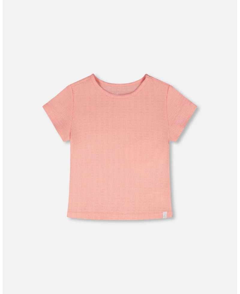 The crinkle jersey t-shirt in peach pink adds a breezy touch to everyday dressing. This tee comes with short sleeves, a round neckline, and a relaxed straight fit that makes it easy to pair with skirts, shorts, or leggings. Crafted in soft crinkle jersey with a hint of stretch, it blends comfort and texture for girls and baby girls alike.