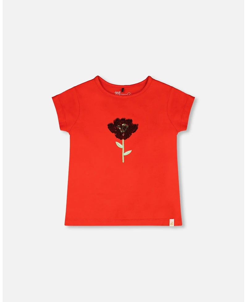 This cotton jersey t-shirt in red is playful and bright for everyday adventures. Designed with a round neckline and short sleeves, this top features a sweet reversible sequin flower at the chest for added charm. A cheerful piece from our “Under The Daffodils” collection, perfect to mix and match with skirts, shorts, or pants.Sizes 2 and 3 years are designed without detachable 3D embellishments to ensure young children s safety.