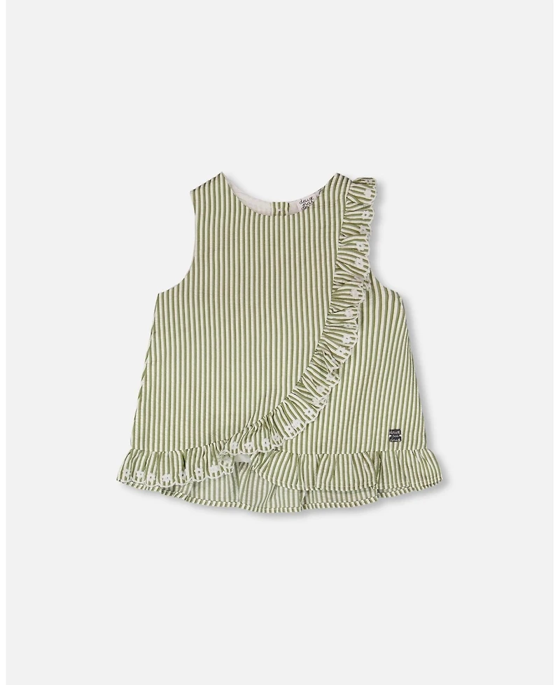 The top in green and off white stripes with embroidered ruffle brings a delicate, feminine touch to summer looks. This sleeveless blouse features a round neckline, vertical stripes, a back button closure, and an asymmetrical ruffle adorned with floral embroidery that cascades across the front. Made from a soft polyester-cotton blend, it s perfect for pairing with skirts or shorts from our “Under My Straw Hat” collection.
