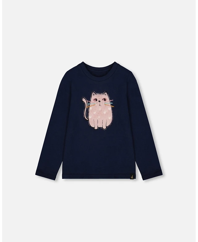 Deux par Deux Girl Cotton T-Shirt Dark Blue with Cat - Toddler|Child