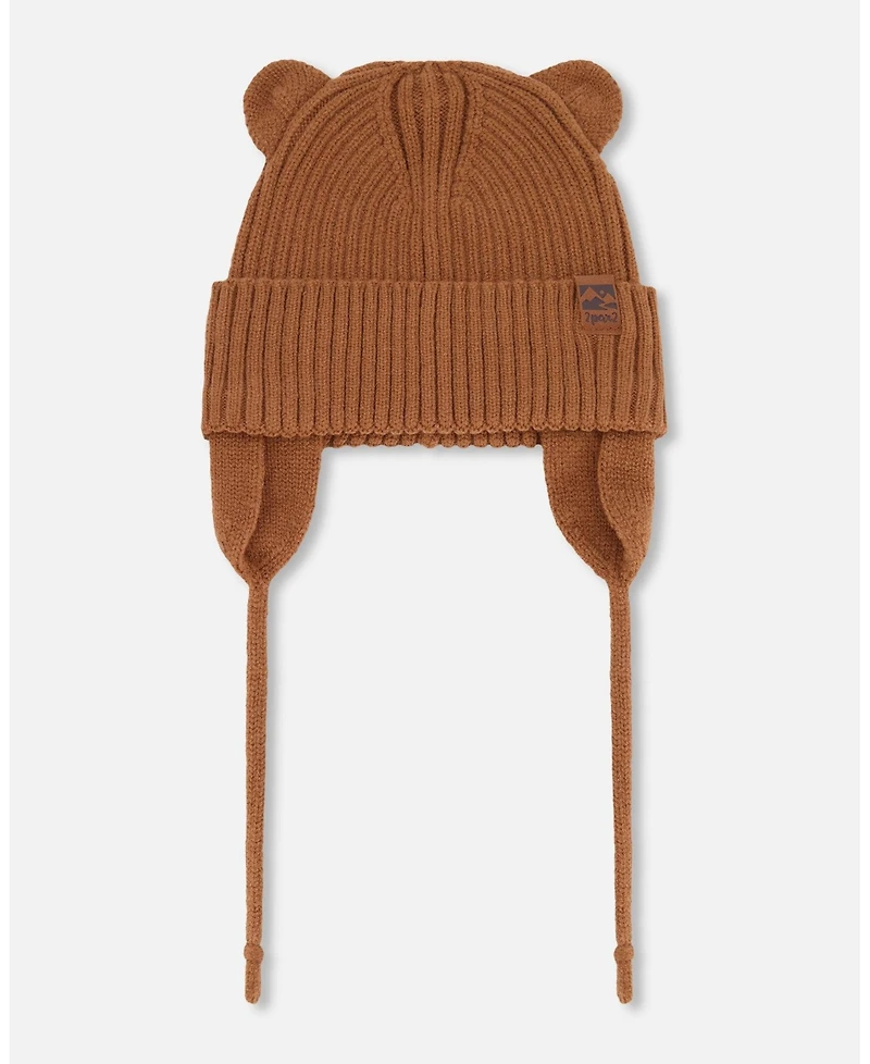 This adorable brown baby knit hat is a sweet blend of comfort and charm. Crafted from a soft ribbed knit mix of viscose, polyester, and nylon, this cute cold weather accessory offers gentle warmth while being breathable for baby s delicate skin. Cute 3D rounded ears add a playful touch, while the adjustable ties keep the hat securely in place. The turned-up brim features a small logo patch, giving it that classic Deux par Deux signature style.