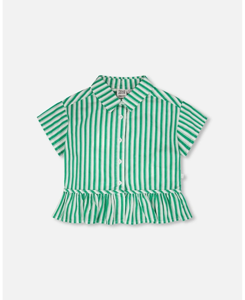 This short sleeve button down shirt in green stripes is both crisp and playful. This top features a classic collar, front buttons, and a bottom ruffled hem that adds a girly twist to its tailored look. Made from 100% cotton, it s soft, breathable, and perfect for sunny days.