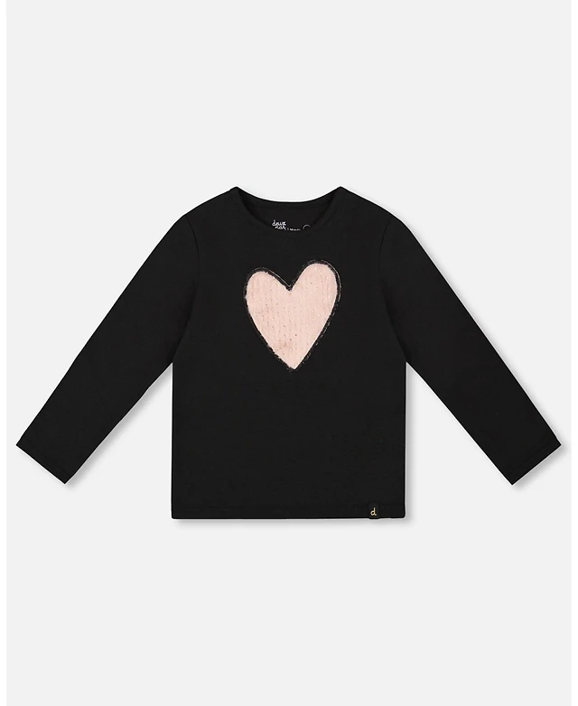 Deux par Girl Cotton Long Sleeve T-Shirt Black with Heart - Child