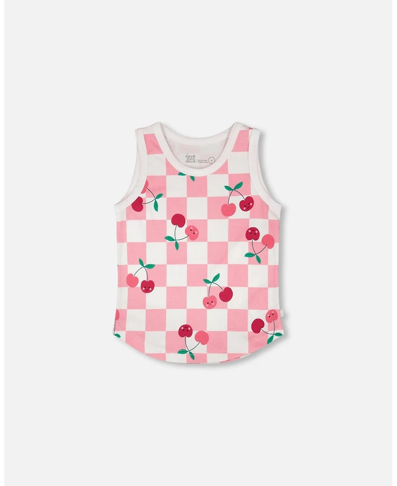 This cotton jersey tank top in pink with printed cherries is a sweet essential for sunny days. The sleeveless tee with a round neckline is finished with an allover checker and cherry print for a playful accent. Made in cotton jersey with added stretch, it is soft, breathable, and comfortable for everyday wear.