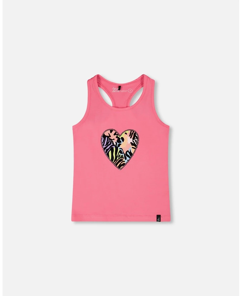 This cotton jersey tank top in pink with screen print is bold and playful. This top features a scoop neckline with racerback straps, a striking heart with animal patterns, adding a wild touch to her summer outfits. Made from soft cotton with added stretch, it offers comfort and flexibility, and pairs effortlessly with bottoms from the “Wild Heart” collection. Sizes 2 and 3 years are designed without detachable 3D embellishments to ensure young children s safety.