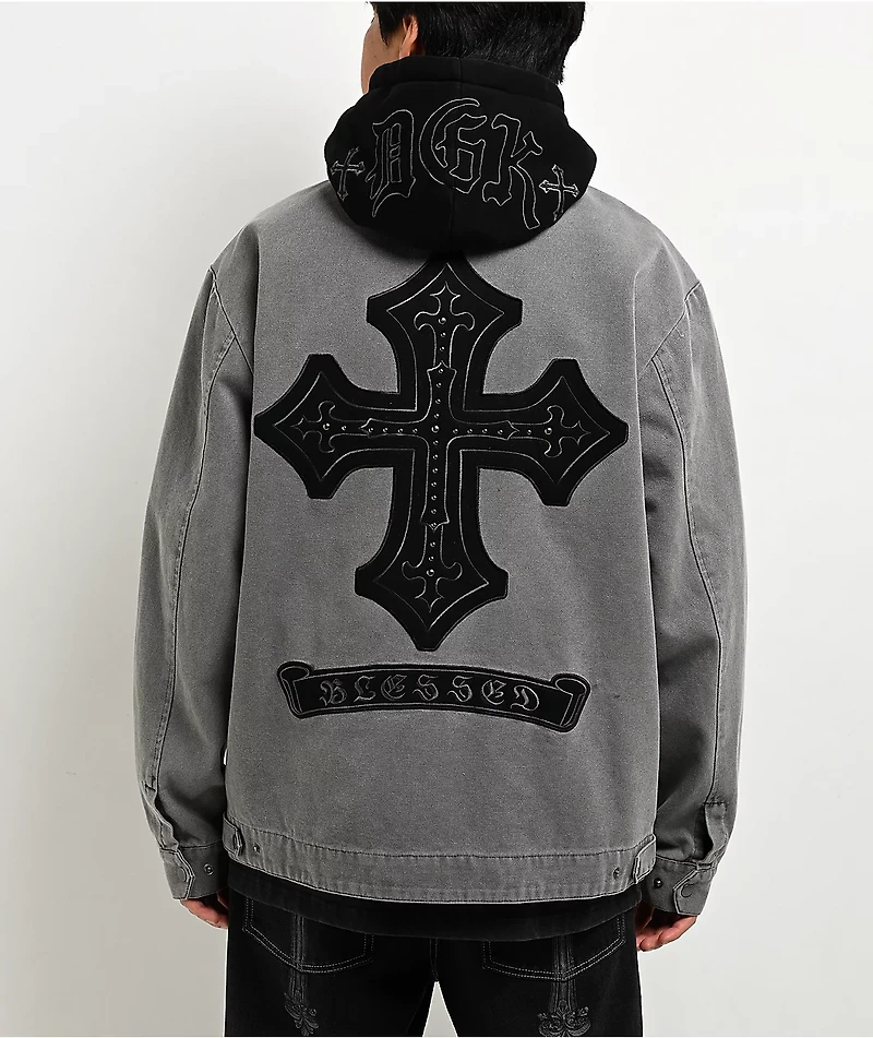 Dirty Ghetto Kids brings a bold edge to the Noble black wash hooded jacket, pairing a structured canvas build with heavy embroidered detailing throughout. Dark lettering across the hood and a large cross on the back create a strong, street goth look