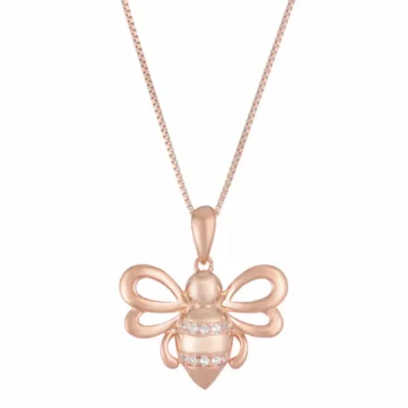 Add a touch of playful elegance with this sterling silver bumblebee pendant, accented with sparkling round diamonds totaling 0.05 ct. t.w. The diamond details highlight the charming bumblebee design, creating a whimsical yet refined look. Suspended from an 18-inch chain with a secure clasp, this delightful pendant is available in sterling silver, rose gold plated, and yellow gold plated finishes—perfect for everyday wear or as a unique, thoughtful gift. Spring ring clasp, 10 Color rating: I, H Clarity rating: I2-I3 Polished finish Prong setting China Imported Product Specifications 18 IN x 14MM x 12MM 0.05 Material & Care Metal, Gold plated Use silver polishing cloth on silver items.