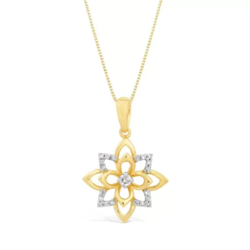 Brighten any outfit with this gold plated sterling silver flower pendant, accented with sparkling diamonds totaling 0.08 ct. t.w. The diamond details highlight the delicate petals, adding radiant shimmer and elegant charm. Suspended from an 18-inch chain with a secure clasp, this graceful pendant is perfect for everyday wear or as a thoughtful gift. Spring ring clasp, 20 Color rating: H, I Clarity rating: I2-I3 Polished finish Prong setting India Imported Product Specifications 18 IN x 22MM x 16MM 0.08 Material & Care Metal, Gold plated Use silver polishing cloth on silver items.