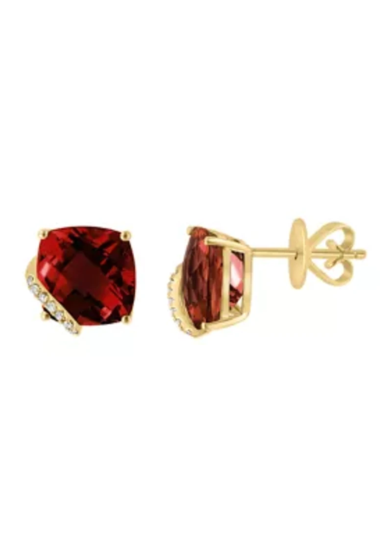 These elegant earrings from Effy® enhance any outfit with their delicate design, offering subtle sophistication that's perfect for all occasions. 14 Diamonds 2 Garnets Post back Color rating: H, I Clarity rating: I1-I2 Polished finish Prong setting Warranty available, limited liability warranty, lifetime Imported Product Specifications 0.40" x 0.34" x 0.06" 0.05 ct. t.w. Diamond, 9.10 ct. t.w. Garnet Material & Care 14K Yellow Gold Clean with a soft cloth