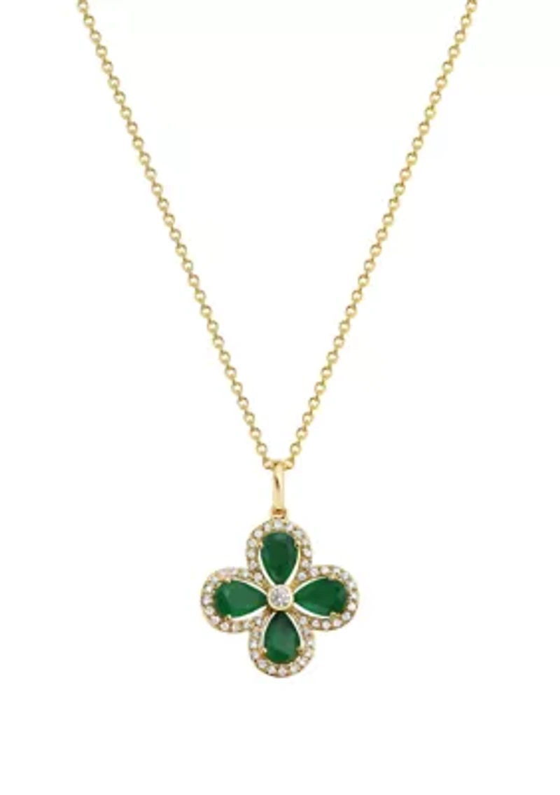 Enhance your ensemble with this diamond and emerald-embellished pendant necklace from Effy®. 48 Diamonds, 4 Emeralds Lobster closure Color rating: H, I Clarity rating: I1-I2 Polished finish Prong setting Lifetime limited liability warranty available Imported Product Specifications 18" L 1/5 ct. t.w. Diamond, 1.52 ct. t.w. Emerald Material & Care 14K Yellow Gold Use gold polishing cloth on gold items
