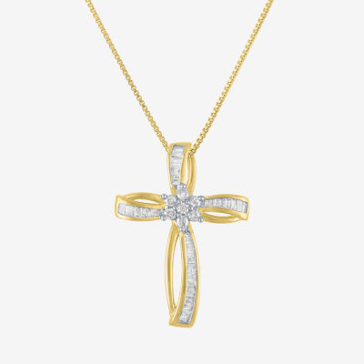 This women's cross pendant necklace offers an elegant take on the classic style. Made from 10K Yellow Gold, it features a multi-stone setting with baguette and round-cut genuine diamonds adorning the cross pendant, and it comes on a fine box chain.