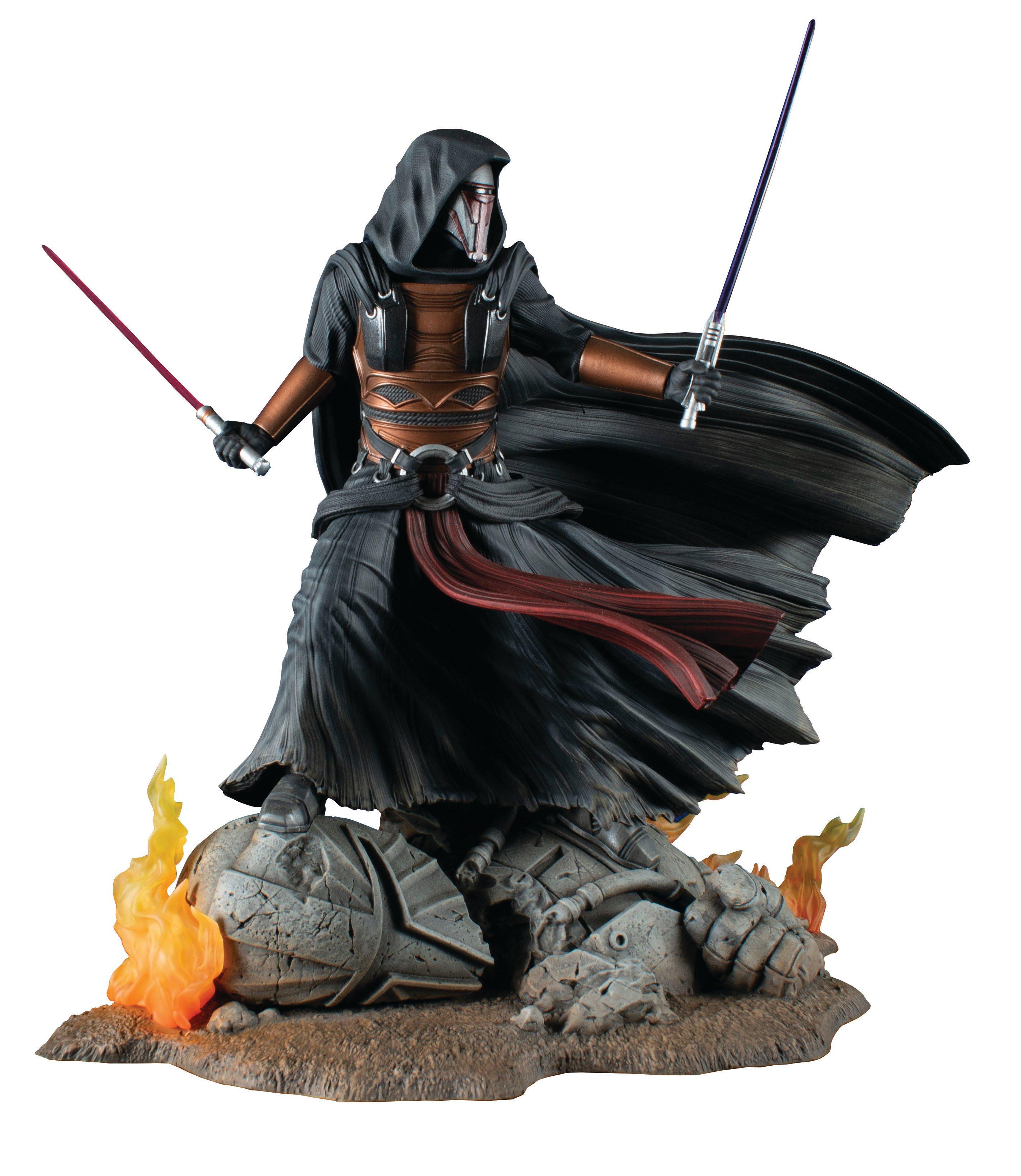 As seen in Star Wars: Knights of the Old Republic, the Sith (or Jedi?) Darth Revan stands atop a flaming statue with two lightsabers and a flapping robe in this all-new Gallery Diorama by Gentle Giant LTD. Featuring detailed sculpting and paint applications, including translucent flames and lightsaber blades, it is made of high-quality PVC and comes packaged in a full-color window box.