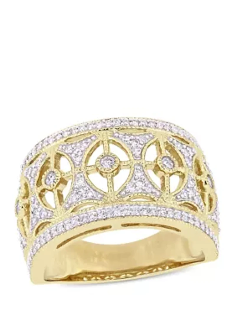 Melt her heart with this divine diamond openwork wide filigree ring. Crafted in sparkling yellow gold, this ring features 121 round-cut, pave and bezel-set shimmering diamond forming a classic pattern around the ring. Enhanced with high-polish detailing. 121 Diamonds Color rating: G, H Clarity rating: I2-I3 Bezel setting Polished finish 1-year warranty Imported Belk Exclusive Product Specifications 12.9 mm Width 1/2 ct. t.w. Diamonds Material & Care 10K Yellow Gold Clean with a soft cloth
