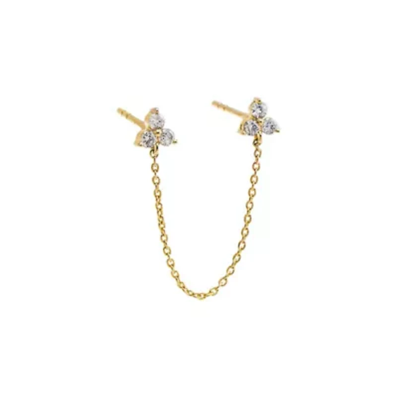 Elevate your ear stack with Adina Eden's diamond trio cluster chain double stud earring, a stunning blend of elegance and edge. Crafted in 14K gold, this unique piece features a trio of brilliant round-cut natural diamonds totaling .15 carats, arranged in a delicate 5mm cluster. A dainty .75-inch chain drop connects the two studs, creating a sleek, modern look with effortless movement. Secured with a classic post back and sold as a single, this earring is perfect for mixing, matching, and layering for a bold yet sophisticated statement. Product Details: • 14K Gold • 6 Brilliant Round - Cut Natural Diamonds • .15 Carats • Trio Cluster: 5 MM • Drop Chain: .75" • Post Back • Sold As A Single Post back Polished finish India Imported Material & Care Metal, Yellow Gold Clean with a soft cloth.