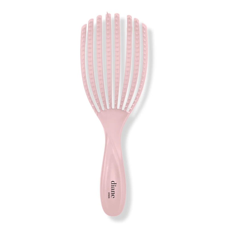 FREEFORM FLEX DETANGLER BRUSH. Features: Flexible open top design. Firm yet flexible pins. Wide-spaced pins. Lightweight with a soft touch finish. Benefits: FIrm yet flexible pins glide through hair without pulling, helping to prevent unneccessary damage. Wide-spaced pins ideal for medium to thick and curly hair. Cushion-less design doesn't harbor any water, a risk for developing mold. Curved brush head hugs scalp for efficient brushing. Ideal for wet detangling. :
