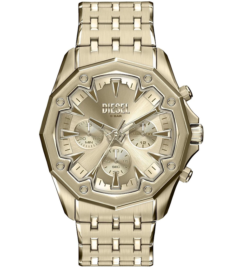 From Diesel, this men's watch features: Stainless steel bracelet and case Sunray dial Double press deployant buckle closure Chronograph movement Case size approx. 46mm Case thickness approx. 11mm Band width: 24mm Inner circumference: 200 /- 5mm Water resistance: 5 ATM Imported.