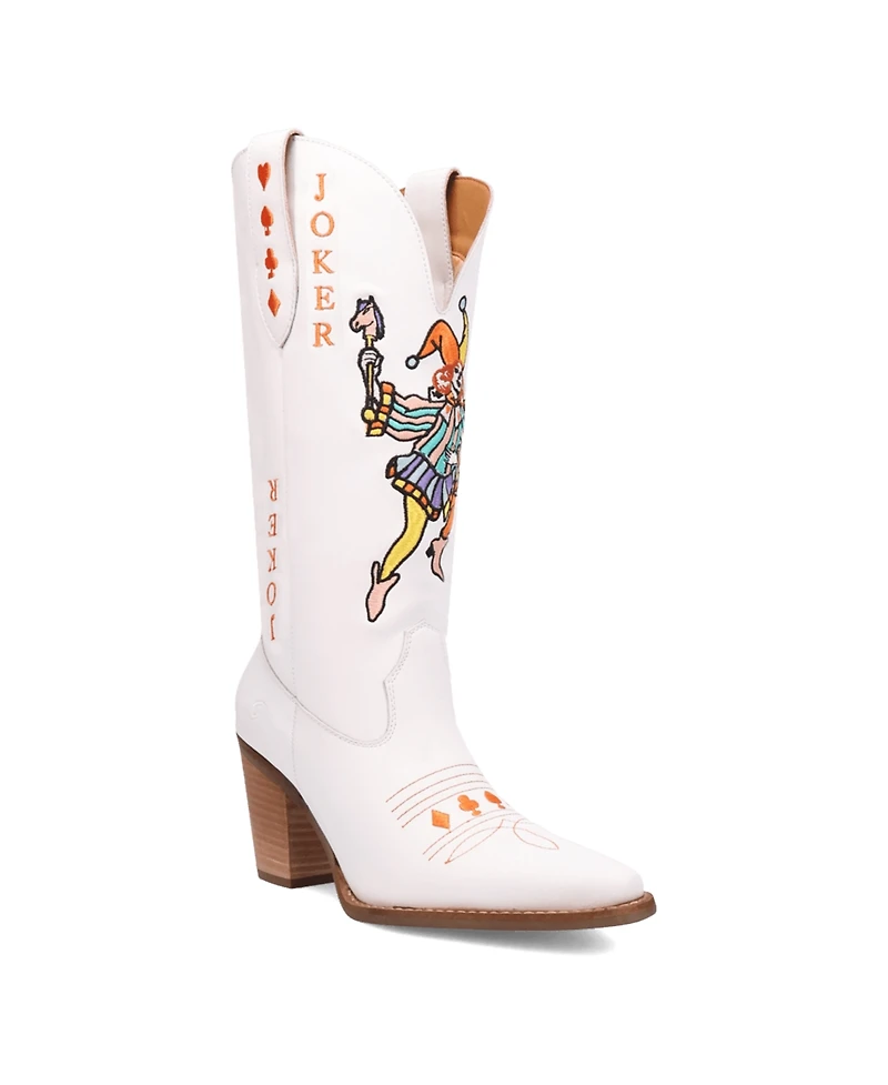 The Joker's wild boot is the ultimate wildcard in our deck-inspired collection. Unlike the bold, classic styles of the other boots in this collection, this boot embraces the unexpected with vibrant colors, playful patterns, and a touch of mischief. Designed for those who don't follow the rules, its sleek silhouette and bold details make it a true standout-because fashion, like a good card game, is all about taking risks.