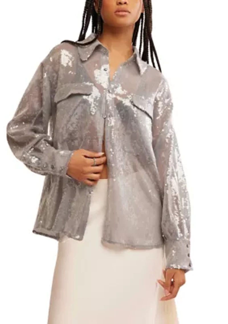 Dazzling sequins add a captivating touch of glamour to this relaxed button-down shirt from Free People. Woven from lightweight fabric for added comfort, it's a chic choice for your next outing. Button closure Collar Long drop shoulder sleeves 2 chest flap pockets Imported Product Specifications 29" Inseam Material & Care Polyester, elastane Hand wash