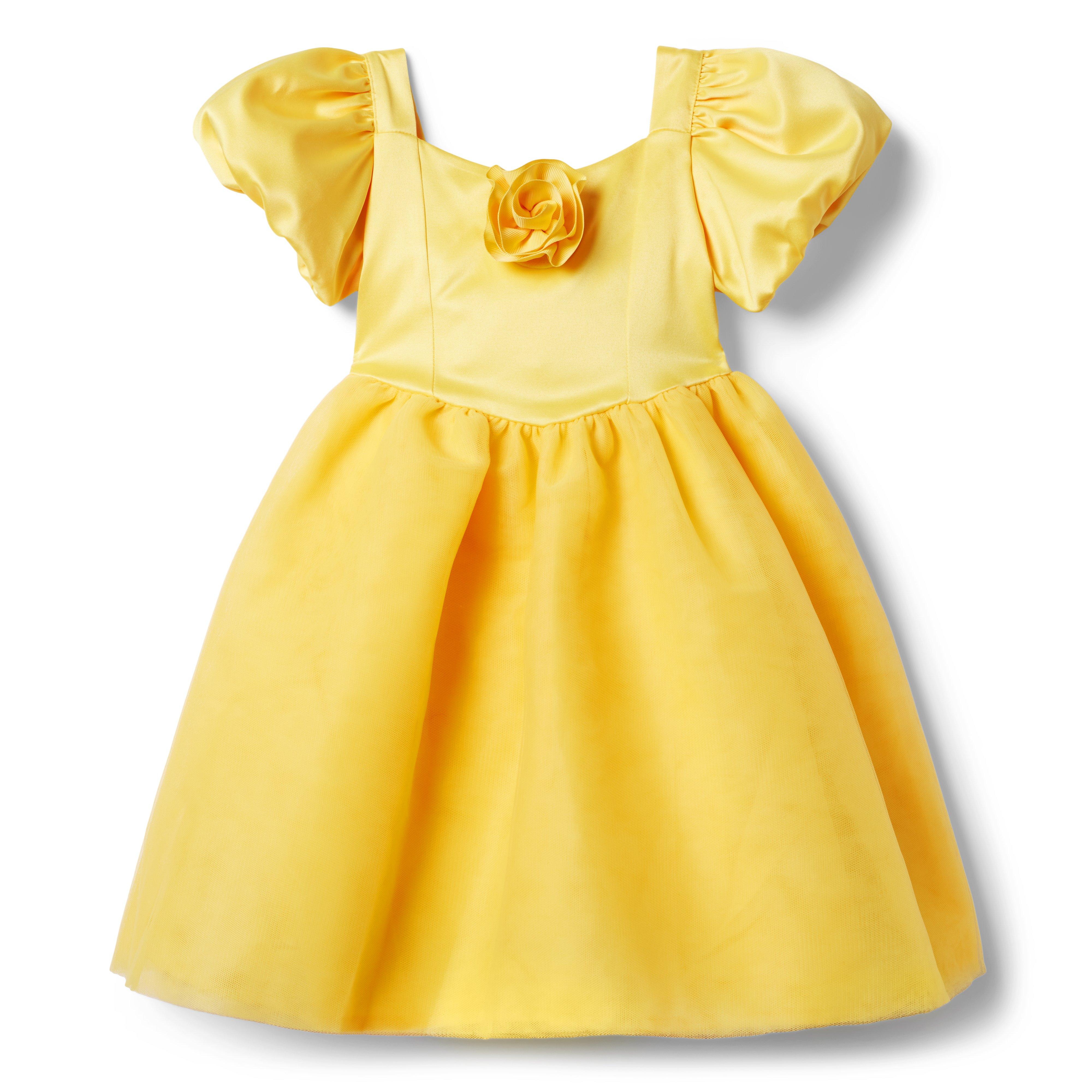 Inspired by Disney's Belle, dress up and dream in the perfect princess look. With puff sleeves, a tulle skirt and rosette detail, it's a dress for the books. 98% Polyester/2% Spandex Satin; Lining: 100% Cotton Fully Lined Button Back Below The Knee Length Bloomer Included (Sizes Up To 18-24M) Online and In Select Stores Machine Washable; Imported