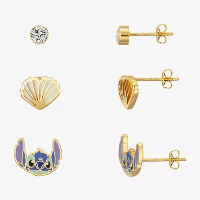Disney Classics Seashell Womens Cubic Zirconia 10K Gold Over Brass Lilo & Stitch 3 Pair Earring Set