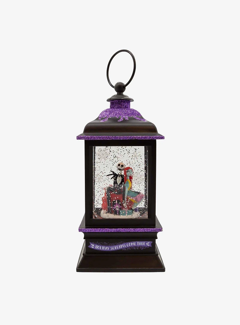 This 9-Inch Battery-Operated Disney Nightmare Before Christmas Jack and Sally Spinning Musical Light-Up Lantern from Kurt Adler is a fun and festive addition to any holiday decor. It features Jack Skellington and Sally sitting on a toy sack surrounded by decorated presents. When activated, this lantern is illuminated with one warm white LED light and plays music and the swirling glitter design gives the scene a snowy effect. Requires 3 AA batteries, not included. Item cannot be shipped to P.O. Boxes
