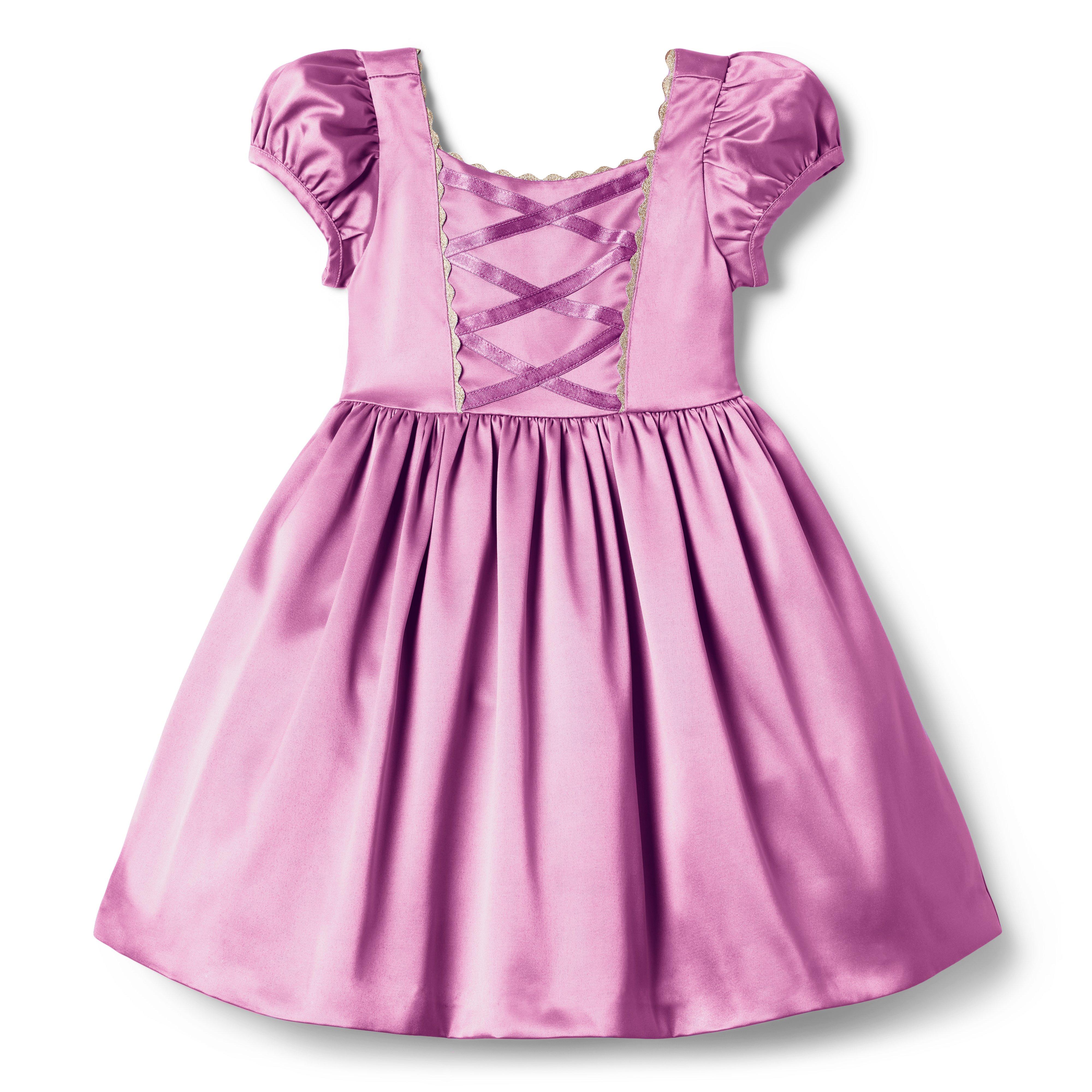 Inspired by Disney's Rapunzel, dress up and dream in the perfect princess look. With puff sleeves, metallic ric-rac trim and lace up ribbon details, it's the dress for every adventurer. 95% Polyester/5% Spandex Satin; Lining: 100% Polyester Fully Lined Button Back Below The Knee Length Bloomer Included (Sizes Up To 18-24M) Online Exclusive Machine Washable; Imported