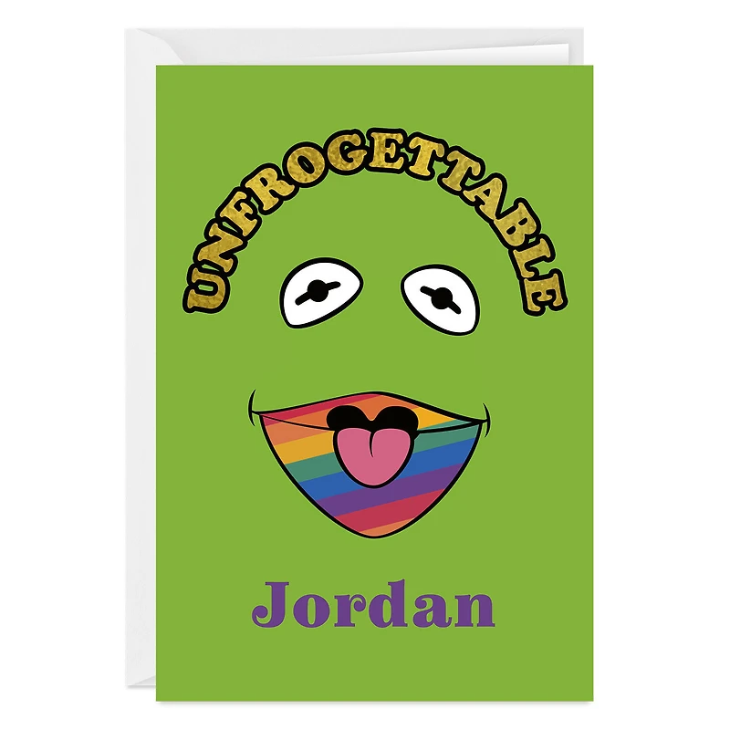 Create your own Hallmark greeting card. Just upload your photos and add a message to send a one-of-a-kind personalized card to a friend, family member, member of the LGBTQIA+ community or ally. Design features Kermit the Frog's face on a green background with a rainbow-striped mouth, paired with a supportive and fun play-on-words sentiment in vibrant gold bubble letters. Vertical folded card.