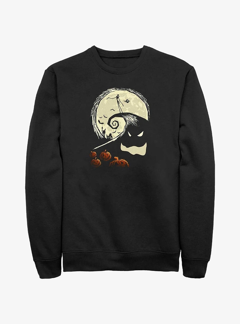 Does that hill look frightfully familiar to you, too?! You bet it does! This crewneck sweatshirt features Jack Skellington standing atop Oogie Boogie himself.