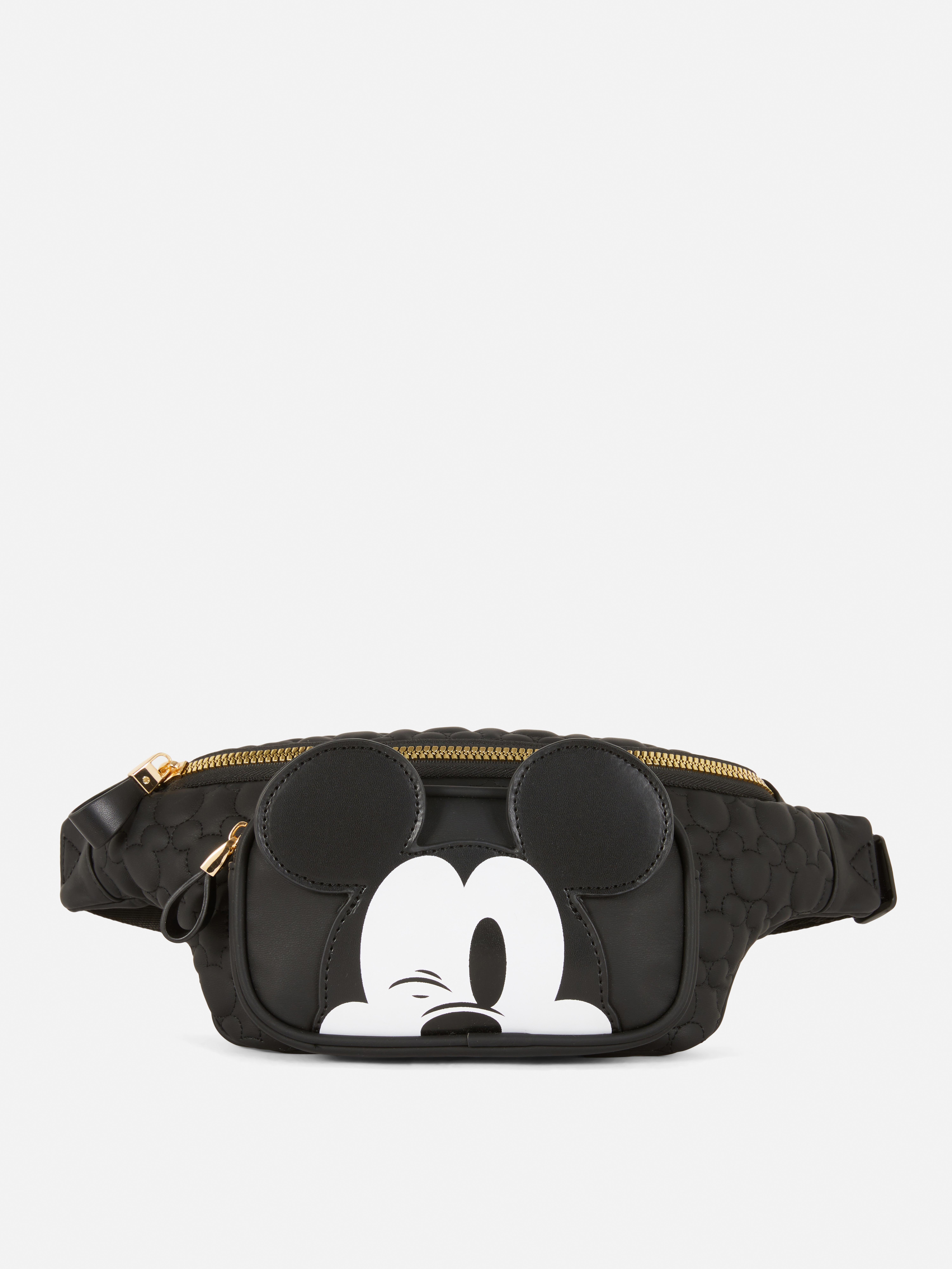 A quilted, 3D Mickey Mouse zip fanny pack with an adjustable strap