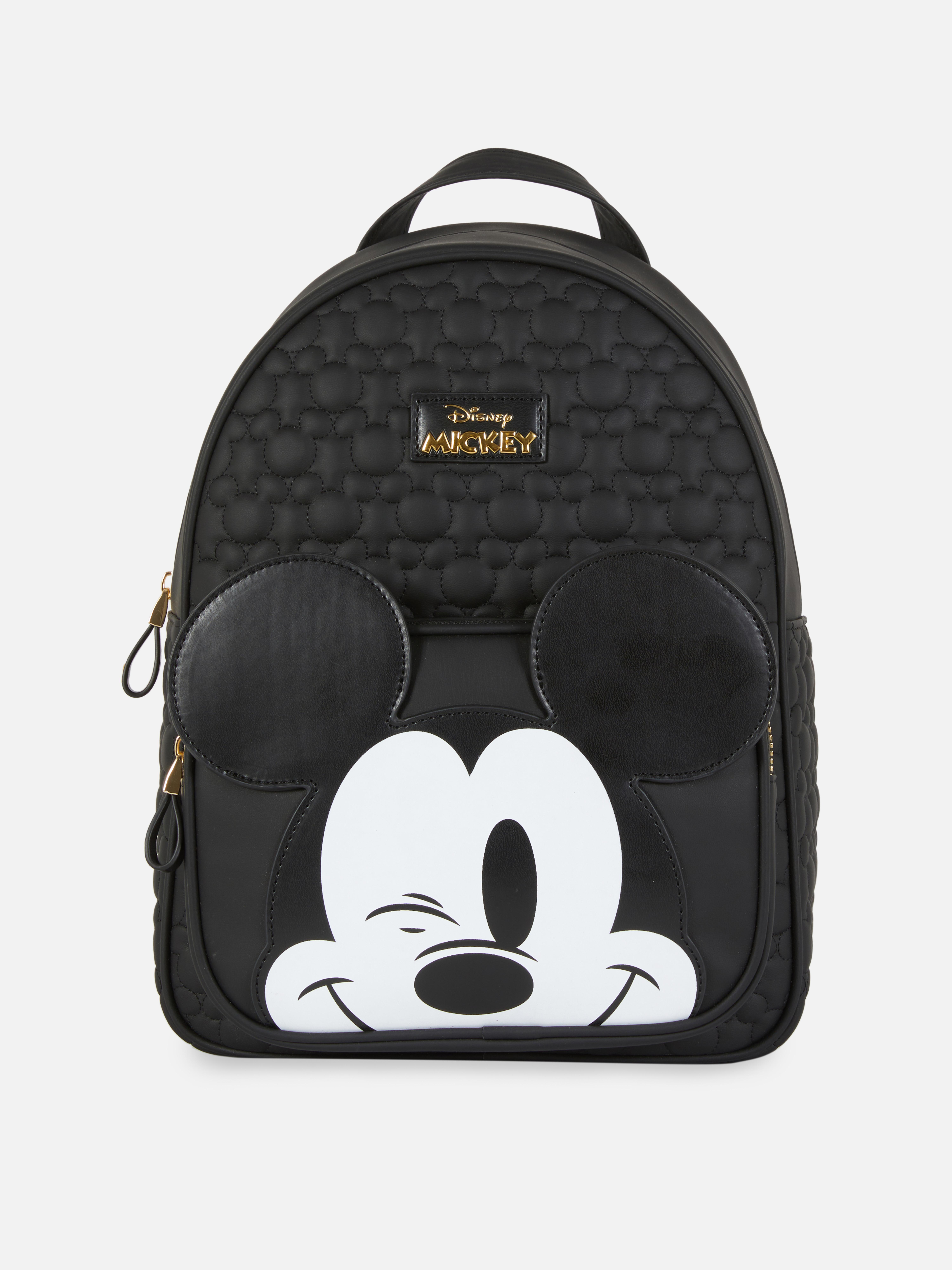 A black backpack with gold tone zippers and embossed Mickey silhouettes