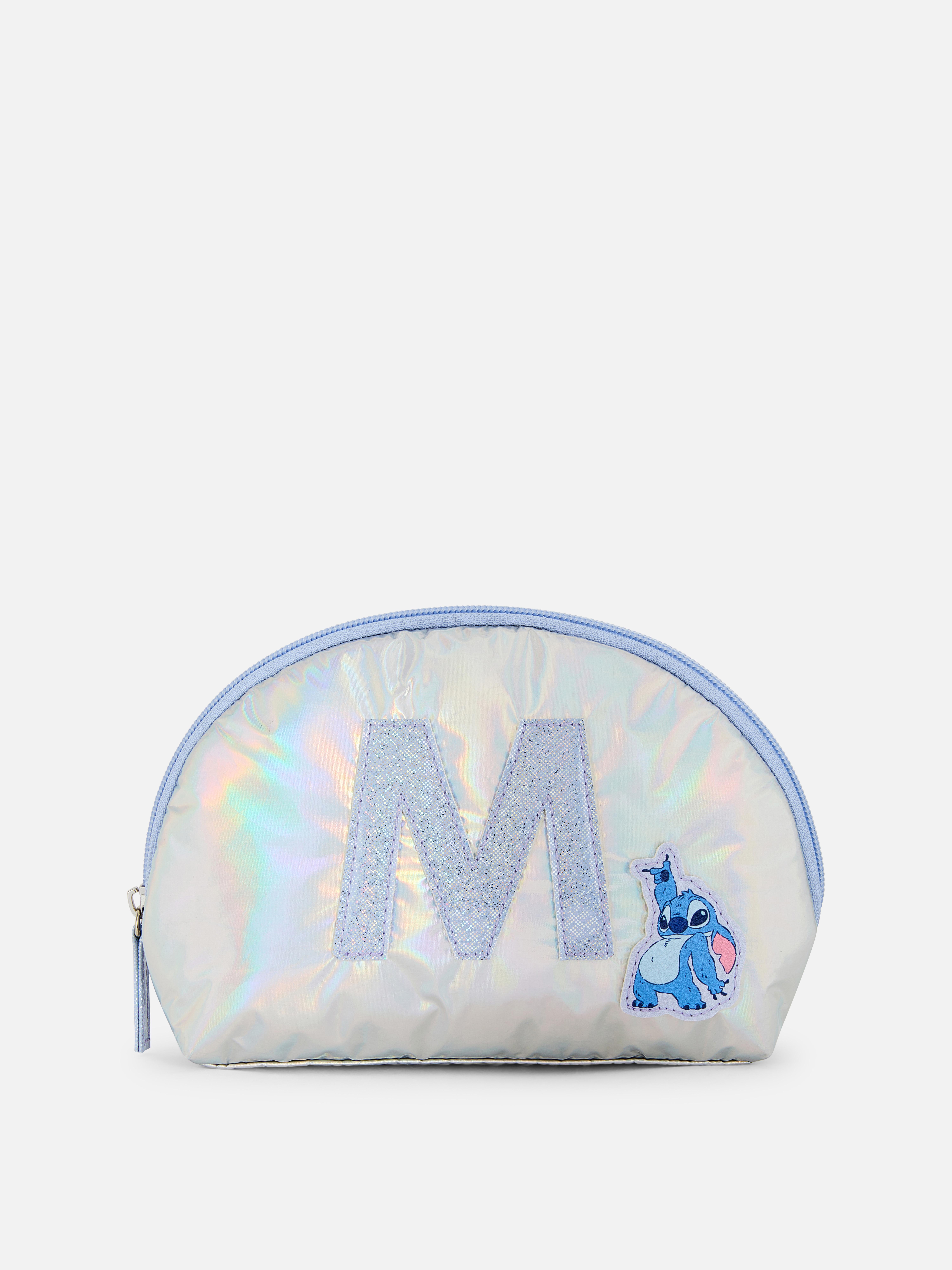 A zip-up Disney’s Stitch bag with a holographic shell and initial design