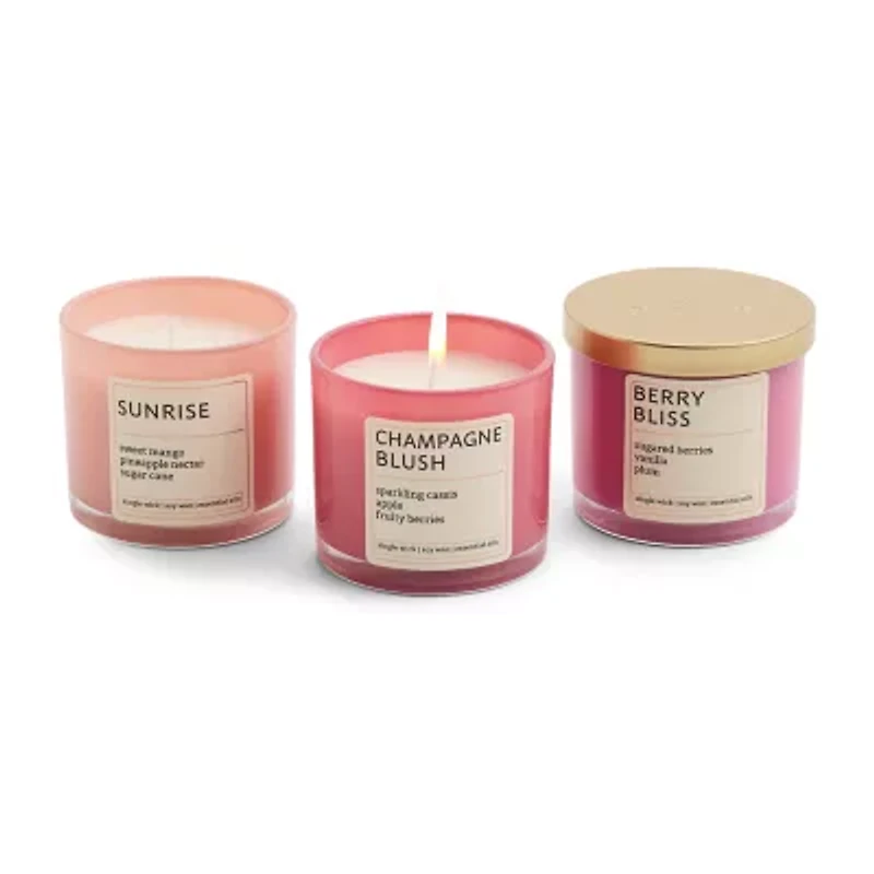 Fire up the scents of this Distant Lands 3-piece set of candles to fill your space with refreshing fragrances. It includes Sunrise with sweet mango and sugar cane, Champagne Blush filled with apple and fruity berries, and Berry Bliss that features vanilla and plum for an aromatic combo that enhances cozy moments at home. Designed with a single wick, they are consistent burn for 25 to 40 hours, it delivers inviting ambiance. Perfect for everyday relaxation or creating a serene atmosphere.