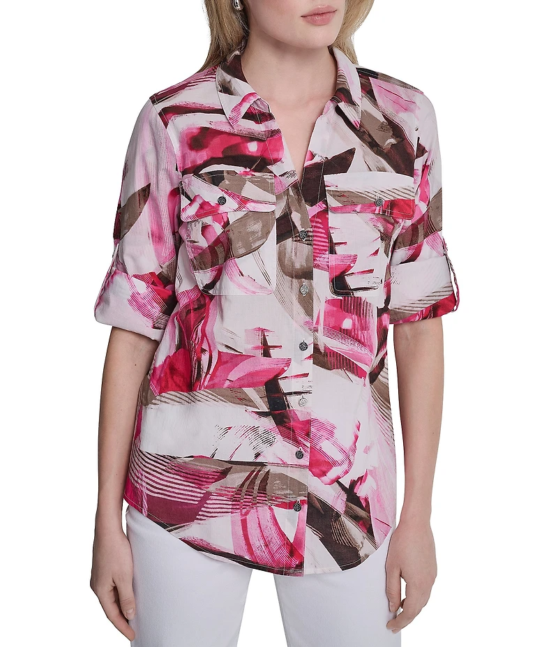 DKNY by Donna Karan Printed Cotton Voile Point Collar Roll Tab Sleeve Button Front Shirt