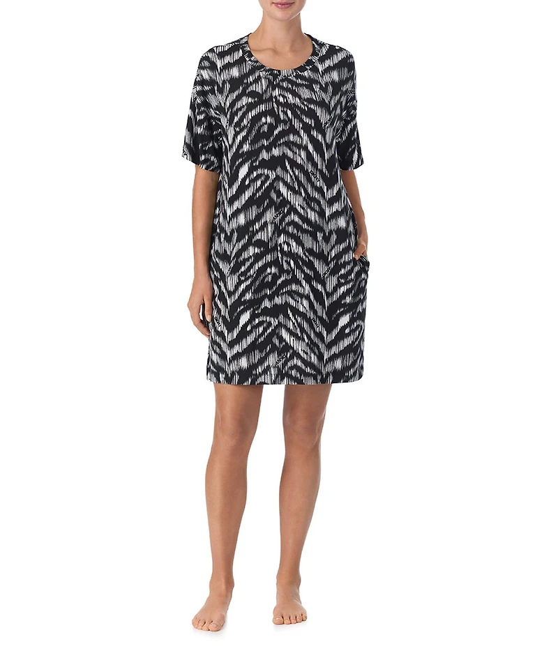 From DKNY by Donna Karan, this sleepshirt features: Zebra print Jersey knit fabrication Crew neckline Short sleeves Side seam pockets Approx. 34" length Modal/spandex Machine wash cold/tumble dry low Imported.