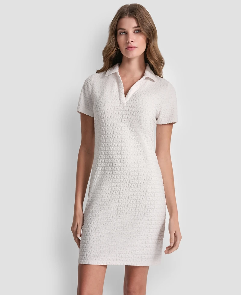 Sport a playful and polished look in this Dkny Jeans dress, featuring an allover logo jacquard print. The split neck and mini polo silhouette create a fresh, modern appeal.