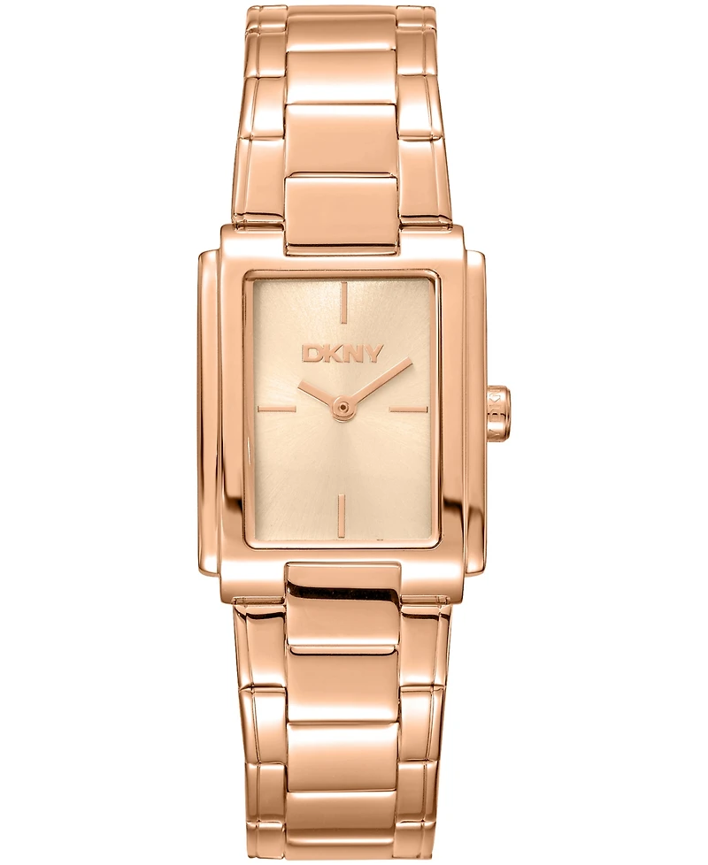 Effortless Edge. Clean Lines. All New York. This Dkny timepiece brings downtown minimalism to your wrist with a refined 23 x 30mm rectangular case and a sleek, high-shine finish. Its clean lines echo the modern architecture of the New York skyline: structured, confident, and always on the move. The polished rose gold-tone case flows smoothly into a matching streamlined bracelet, creating a silhouette that's both subtle and striking. Whether worn with everyday tailoring or after-hours looks - this compact icon - powered by a reliable Seiko movement, delivers effortless style for those who move through the city with purpose.